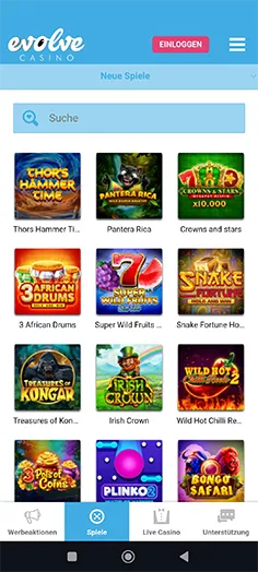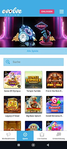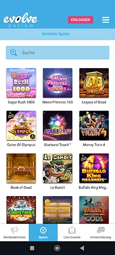 Evolve Casino ist eine moderne und attraktive Glücksspiel-Webseite, die mit mehr als 4.000 erstklassigen Spielen gefüllt ist. Den Spielern werden neue und spannende Steckplätze garantiert dank der Partnerschaften mit über 30 führenden Anbietern. Das Unternehmen ist völlig legal, und jeder deutsche Nutzer, der volljährig ist, kann hier um echtes Geld spielen. Genießen Sie die Vorteile des Casinos, registrieren Sie sich bei Evolve Casino und beginnen Sie zu gewinnen mit einem Willkommensbonus von 1000 € + 100 Freispiele!