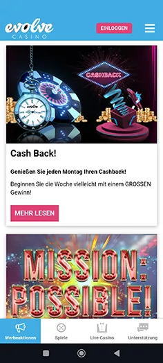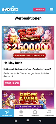 Alle Boni auf der Evolve Casino-Website finden Sie auf der Registerkarte “Promotions”. Informationen über aktuelle Anreize finden Sie unten.