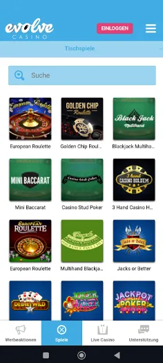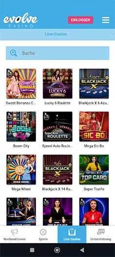 Die gesamte Live-Unterhaltung im Evolve Casino ist in einem separaten Bereich zusammengefasst. Hier spielen Sie mit Live-Dealern, die während der Übertragung mit Ihnen sprechen, Einsätze annehmen und Runden leiten. Den Spielern stehen sowohl klassische Spiele als auch Game Shows zur Verfügung. Die Liste umfasst: